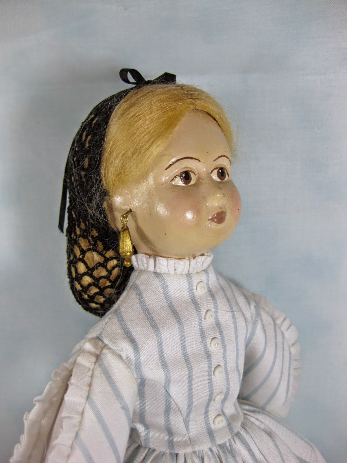 Annabelle here is wearing her bonnet wig, which has hair on the front, sides and a little on the back, designed to fit under her bonnets. The bonnet is made of white hat straw, with silk ribbon trim and ties. I made the bonnet pattern to fit Annabelle's head. Do click on the picture to bring up a larger version.